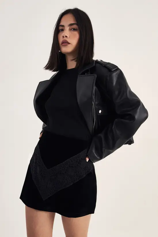 Оставете впечаток на вашето следно излегување со оваа впечатлива мини здолниште од кадифе со вметната чипка од NastyGal. Раскошната кадифена ткаенина создава богат текстурен контраст наспроти деликатниот чипкан панел, додека мини должината и асиметричниот дизајн работат заедно за да создадат смел, современ изглед. Стилизирајте со тесен црн топ и кожна јакна за елегантен ансамбл што привлекува внимание на шанкот. За погламурозен пристап, комбинирајте го со свиленкаста камизола, впечатливи обетки и потпетици со ременчиња. Ова разновидно парче одлично функционира за пијалоци со пријатели, клупски вечери или за секоја пригода каде што сакате да привлечете внимание. Карактеристичниот дизајн ви гарантира дека ќе се издвоите од толпата, а воедно ќе ја задржите таа лесна кул естетика по која е позната NastyGal.